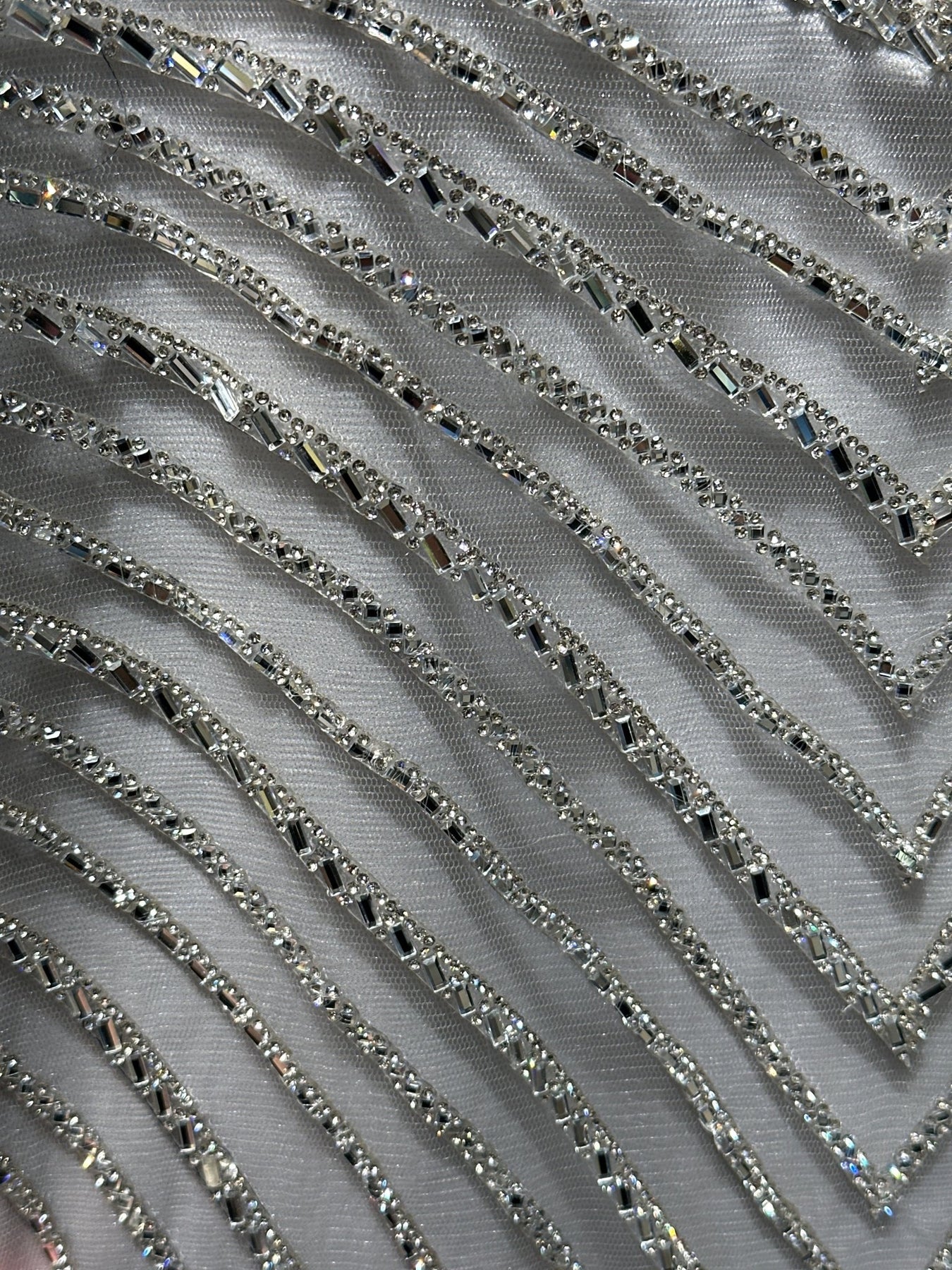 الجزء العلوي مصمم بأسلوب كورسيه شفاف يحدد الخصر بانسيابية ويُبرز جمال القوام، فيما تضيف فتحة الرقبة على شكل قلب والأكتاف المكشوفة لمسة أنثوية جريئة وفاخرة