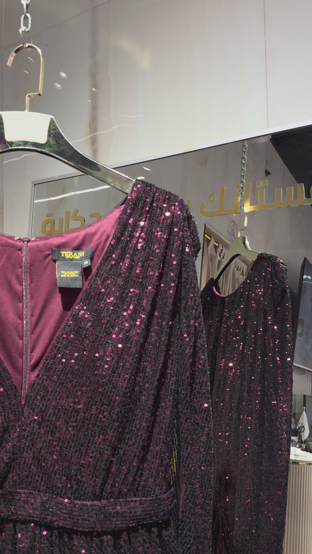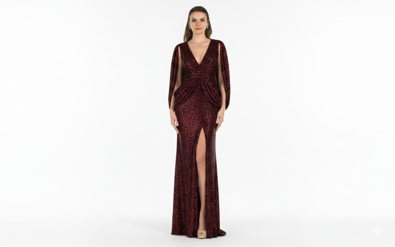 فستان Terani 2021M2962 Wine Plus مصنوع من نسيج الترتر اللامع (Sequin Fabric)، الذي يمنح الفستان بريقًا استثنائيًا تحت الضوء ويعكس الفخامة في كل حركة. الترتر مثبت على قاعدة قوية من القماش تدعم شكل الفستان وتبرز التفاصيل الدقيقة، مع لمسة انسيابية تجعل كل خطوة تخطينها مليئة بالحركة والجاذبية