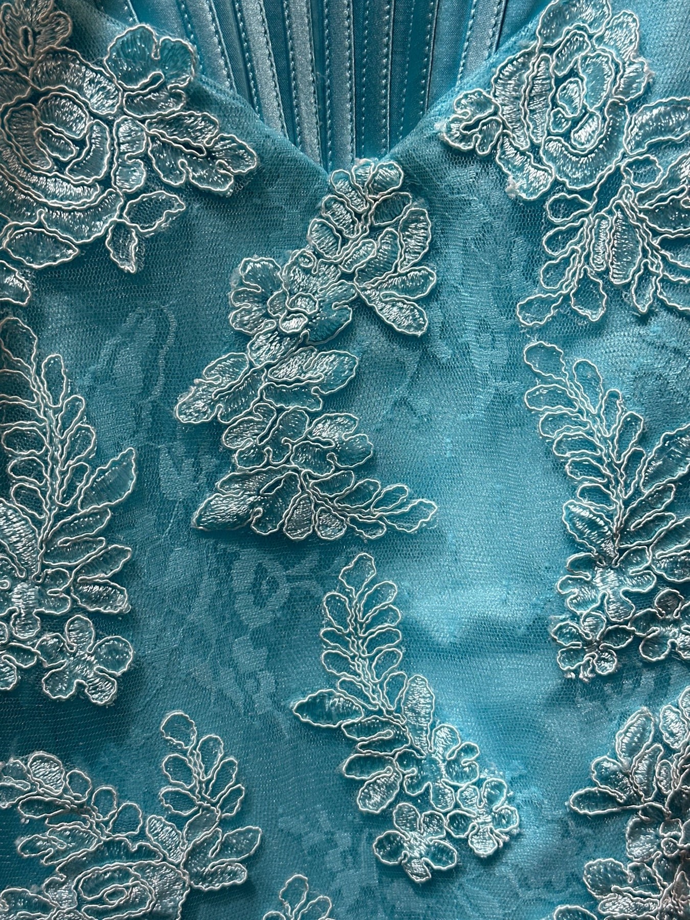فستان سهرة بستايل أنيق وراقي، يتألف من صدرية مشد كلماتان ساتان تضيف تثبيتًا وجاذبية، وتنورة دانتيل شفافة مع فتحة جانبية أنثوية تمنحك حركة وجرأة