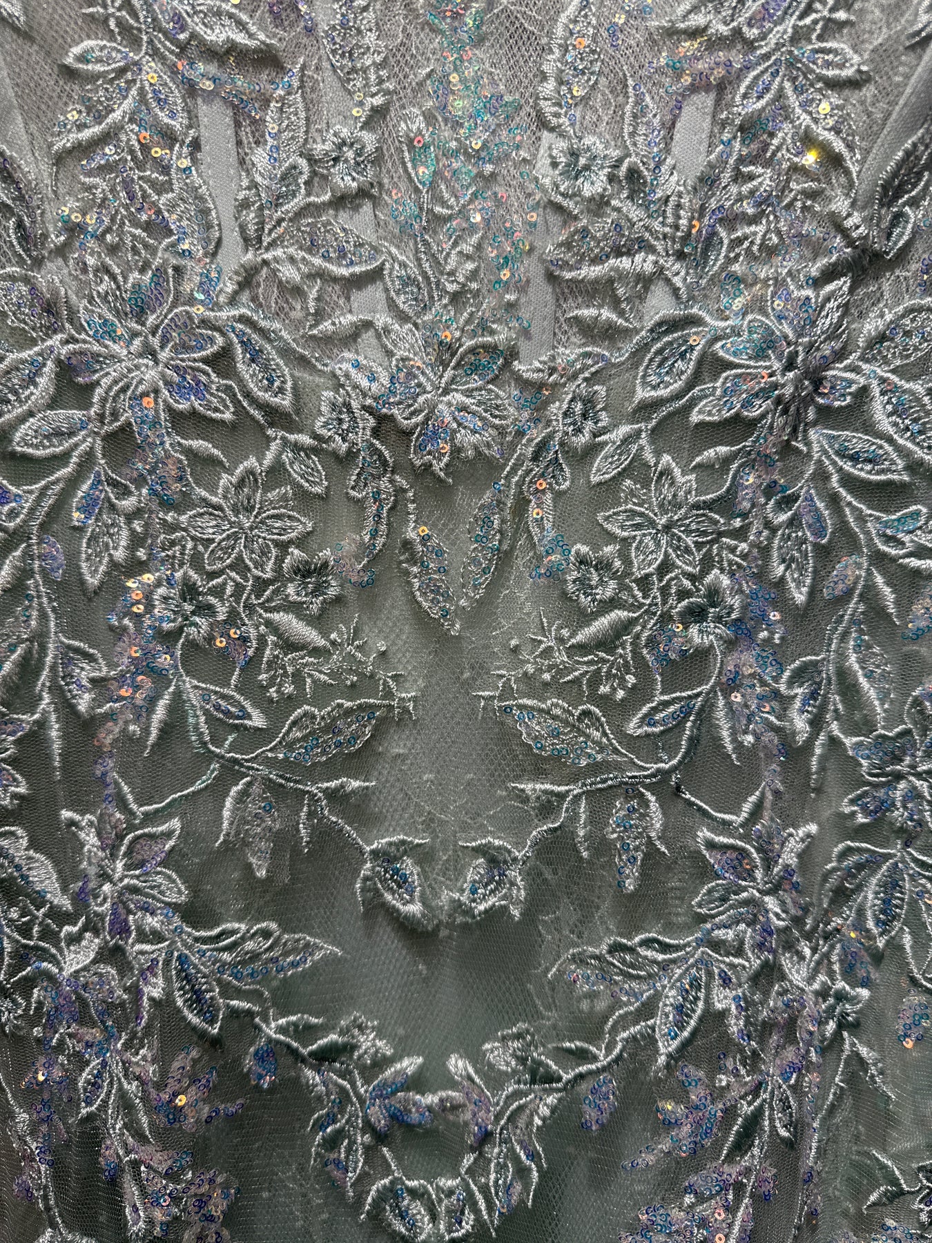 الجزء العلوي مصمم بشكل “كورسيه” شفاف مزخرف بالدانتيل المطرّز، يمنح لمسة فاخرة على منطقة الصدر