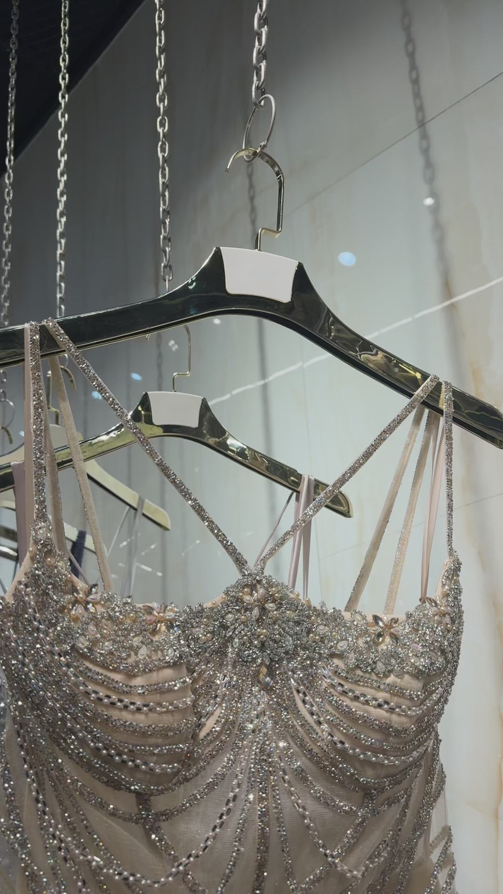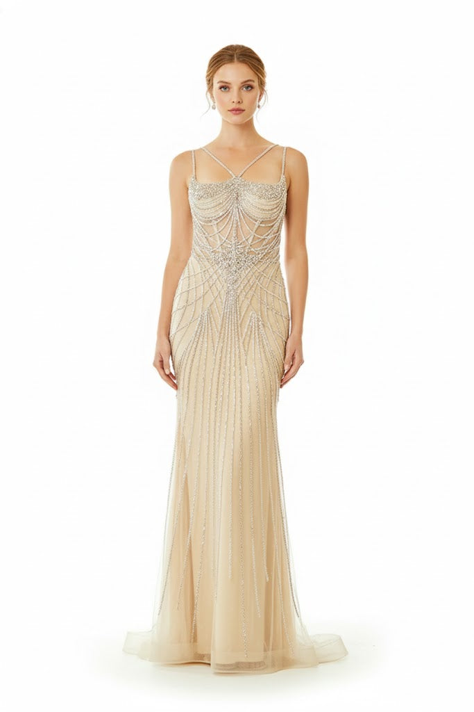 Shine with a captivating look in a luxurious beige dress; a long mermaid -style design that flows gracefully and elegantly accentuates the figure.