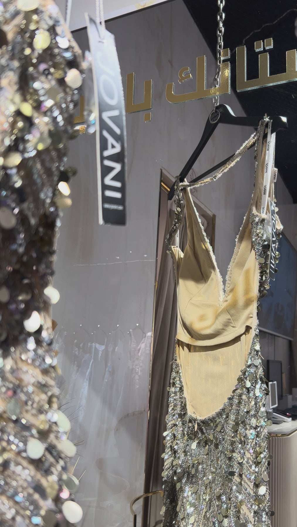 With a daring neckline that adds a touch of drama and allure, the high slit adds a sexy edge, while shimmering sequins create a captivating effect. Perfect for high-profile occasions.
