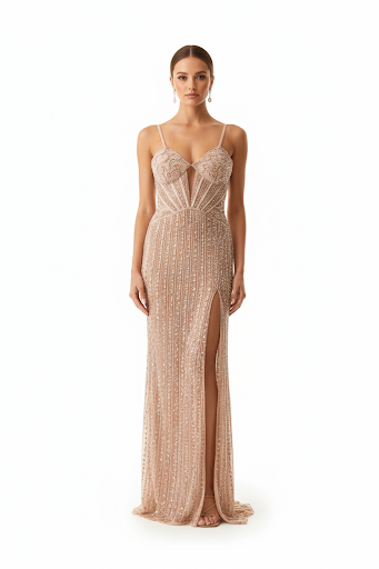 It comes in a soft nude color that gives your look a sophisticated touch that exudes femininity and luxury, with a flowing cut that highlights the beauty of the figure and gives you a striking presence at every occasion.